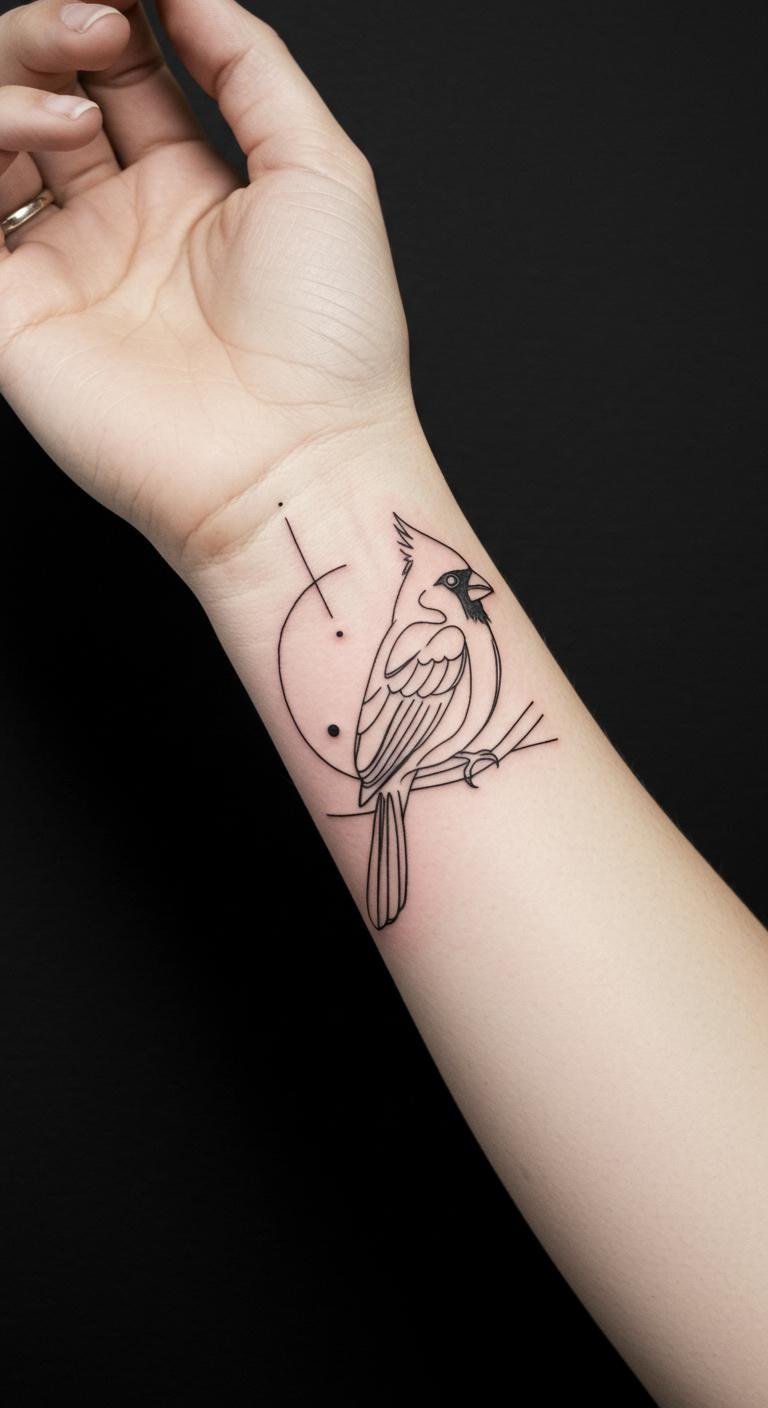 Modern line art cardinals on the wrist feel current. Clean lines rule. Draw modern styles. Use line art apps. Find modern rates. Stick to lines only. Wear watches over it. Add curves for edge. Trendy for now. Try with line drawings. Keep it fresh and direct.