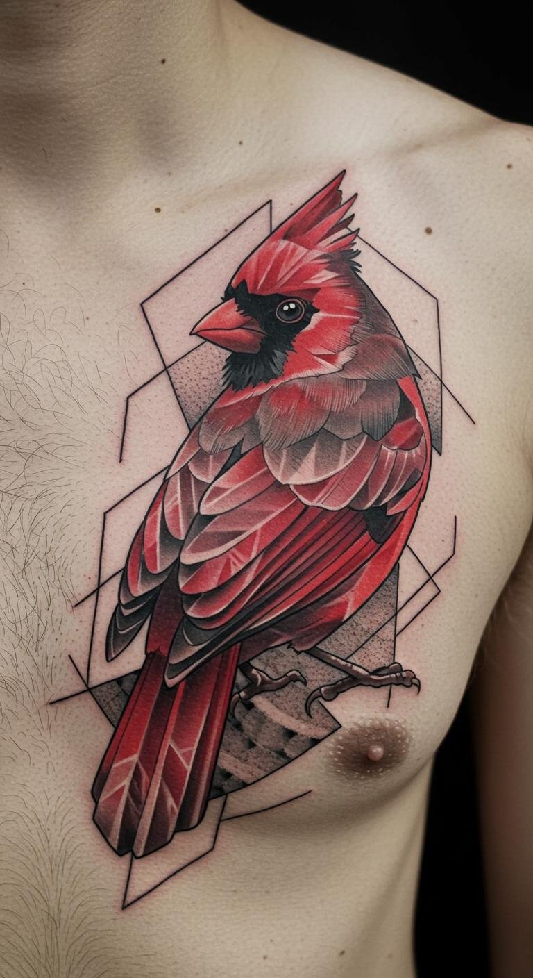 Geometric cardinals use shapes for a modern twist. This adds edge to the bird. Draw grids on paper to plan. Use apps for geometric tools. Look for studios with flat rates. Opt for black and white savings. Position on the chest for impact. Mix in triangles for style. Perfect for minimalists. Try with stencils first. Keep it clean and structured.