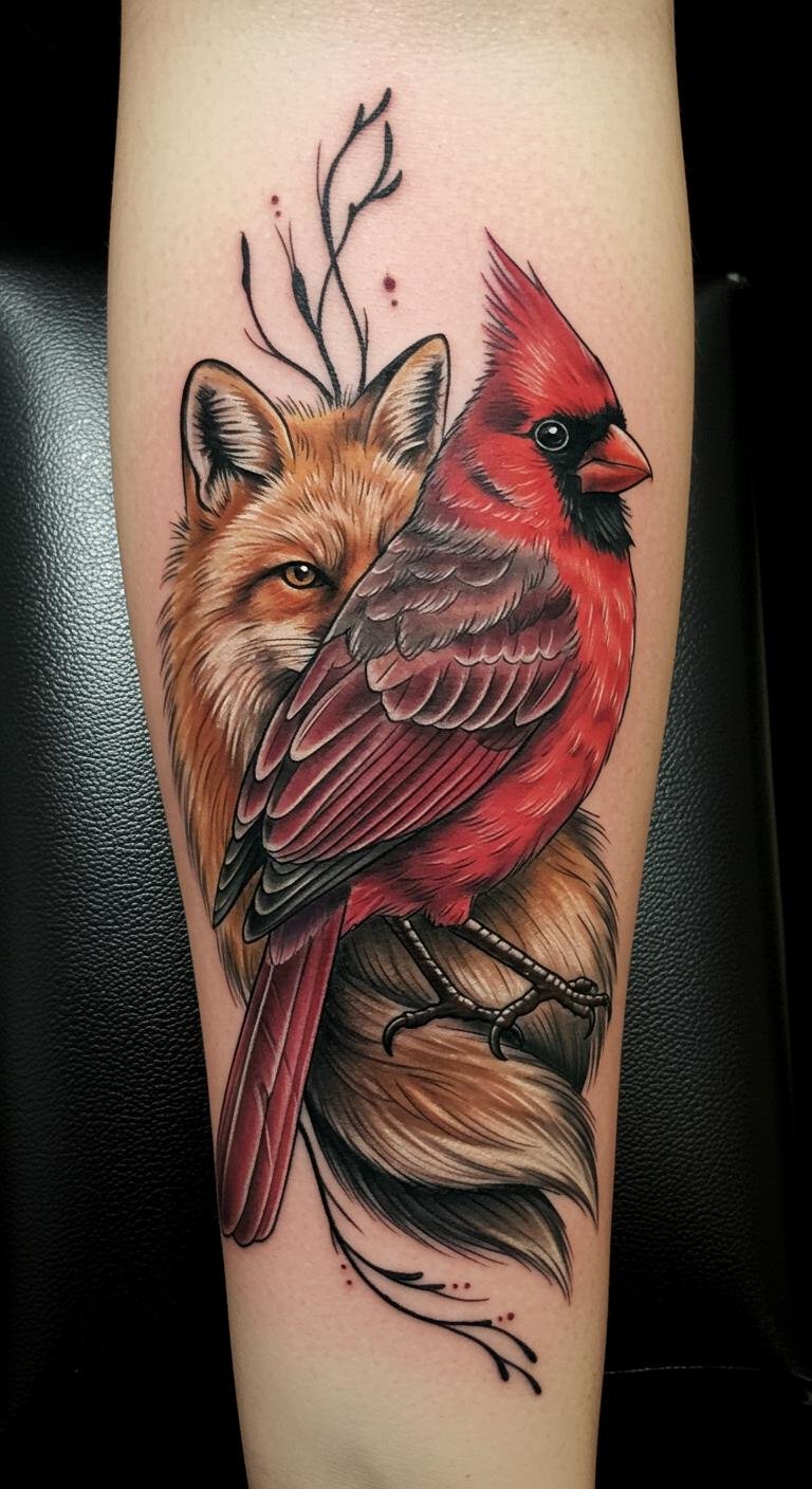 Combine a cardinal with a fox for adventure. This duo tells a wild story. Sketch animals side by side. Download free motif guides. Find artists who bundle designs. Stick to simple lines for budget. Place on the leg for fun. Add eyes for connection. Ideal for storytellers. Use face paints to preview. Make it playful yet meaningful.