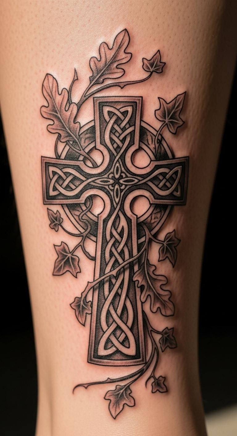 Draw from nature for your Celtic Cross. Leaves and vines make it earthy. This reflects growth and cycles. Sketch outdoor elements from photos. Free nature apps provide inspiration. Use leaves to trace designs at home. Artists might add these for less cost. Place it on your leg for a grounded look. This approach keeps your tattoo vibrant.