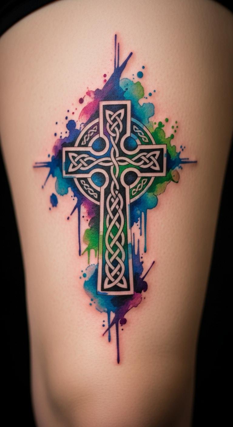 Try a watercolor look for your Celtic Cross. Soft blends give it an artistic feel. It mimics painted art. Experiment with watercolors on paper. Free apps simulate the effect. Use washable paints for trials. Find artists who do this style affordably. They may use basic techniques. Place it where colors pop. This idea brings creativity to your ink.