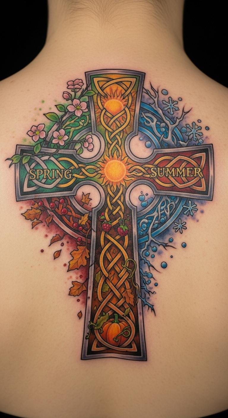 Go for a Celtic Cross that pops with colors. Reds and greens bring the design alive. It adds a fun layer to the traditional look. Draw inspiration from nature photos online. Try coloring in your sketches with markers at home. This helps you see what works. Find budget ink sets if you experiment with temporary tattoos. Choose an artist who uses safe, cheap color options. They can suggest ways to mix shades without extra fees. Place it on your back for a bigger canvas. You’ll have a design that feels fresh and expressive.