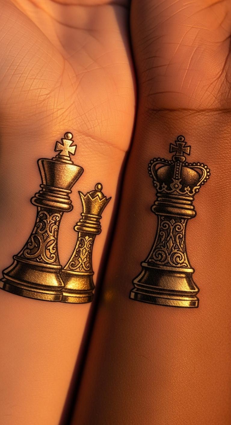 Matching chess tattoos build bonds with partners. Choose this for shared moments. A king and queen pair is popular. Draw mirror images at home. Free websites offer couple templates. Prices are about $150 total. Matching tattoos symbolize teamwork. Put them on fingers or arms. Add hearts for extra meaning. This keeps costs low. Try henna versions first. They last a week. Use simple shapes to start. These designs strengthen ties. Get one that fits your duo.