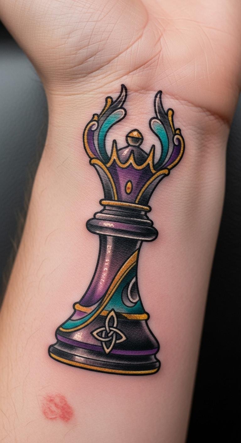 Chess tattoos in metallic colors bring shine to skin. Go for gold or silver effects. A queen piece pops with this. Test shades with markers first. Online tutorials guide you. Fees start at $100. Metallic colors mean luxury on a budget. Put on your chest for impact. Blend with black outlines. This style draws eyes. Use cheap metallic pens for trials. They work wonders. These tattoos elevate simple ideas. Choose shades that last.