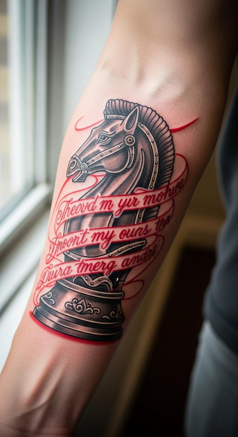 Chess tattoos with quotes add words to wisdom. Select this for inspiration. Pair a pawn with a short saying. Write ideas in a notebook. Apps help with font choices. Artists might charge $80. Quote tattoos like “Checkmate life” motivate. Place on your back for subtlety. Use basic fonts to cut costs. Mix with pieces for depth. Practice handwriting at home. It builds skills. These tattoos guide daily choices. Keep them short and bold.