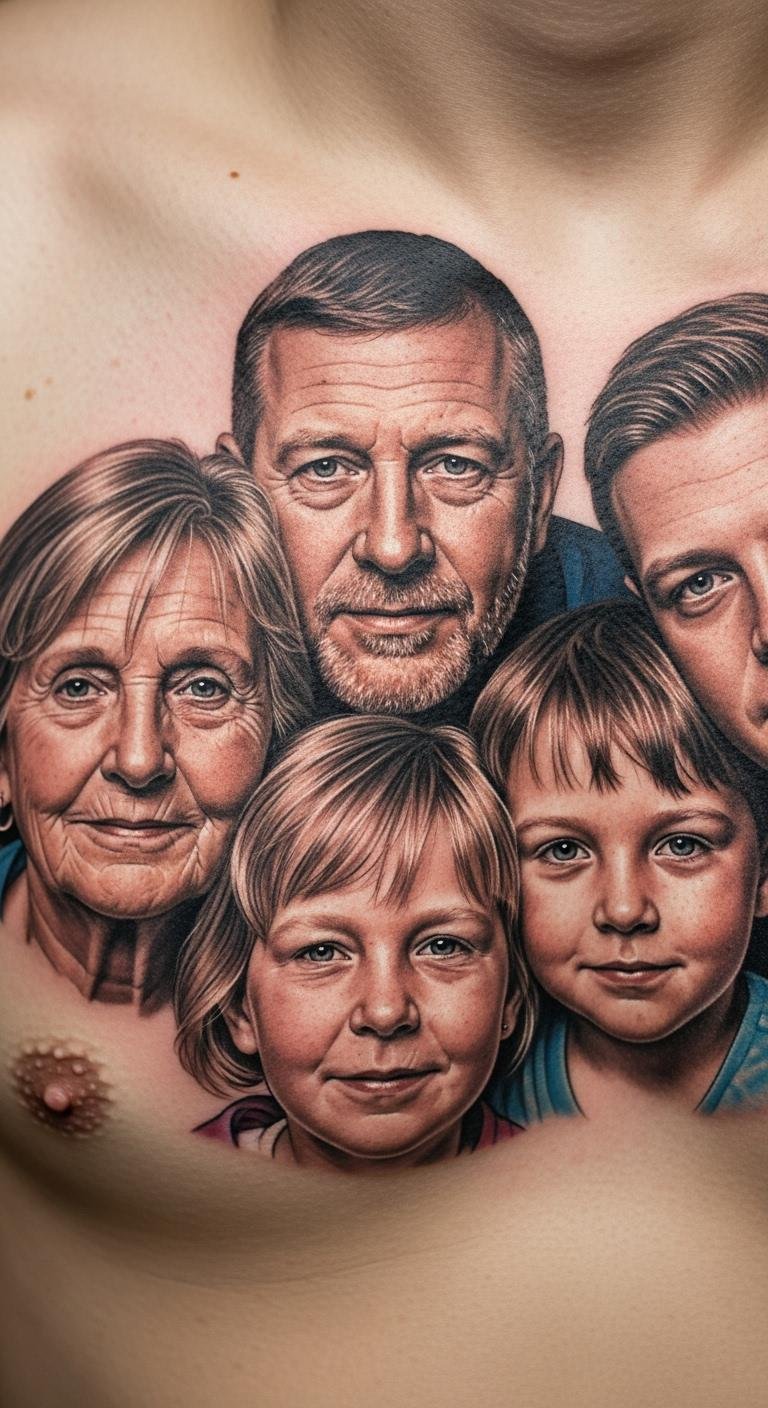 A realistic family portrait on your chest keeps memories close. It captures fine details that feel alive. Start by gathering old photos and tracing them lightly with a pencil. This gives you a personal touch. For a thrifty option, use a phone app to edit and preview the design on your body. Seek artists who do hyper-detailed work; check local shops for affordable packages. Go for grayscale to cut expenses. Highlight one face as the focal point for simplicity. Test with temporary tattoos from stores to see how it fits. This method helps you honor loved ones without overspending. In the end, your tattoo becomes a daily reminder of bonds.