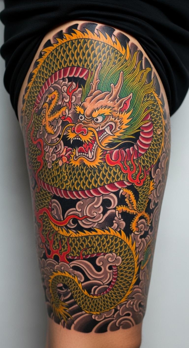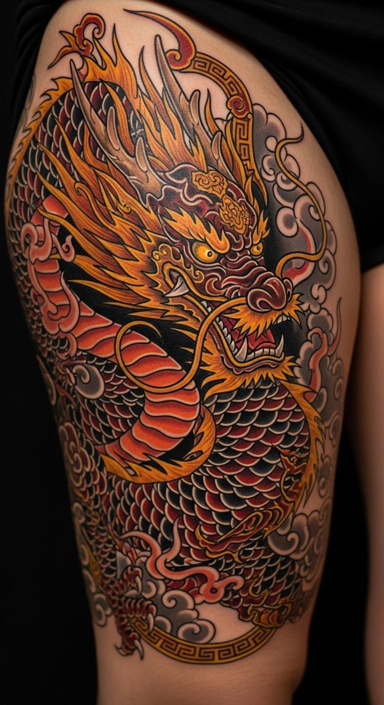 Go large on your thigh for a dragon that commands attention. It symbolizes enduring strength. Map it out with simple tools. Use free body mapping software. Break into affordable segments. Bold thigh scale elements. Show with shorts or pants. Preview with large stickers. Studios have options for all budgets. Make a bold statement.