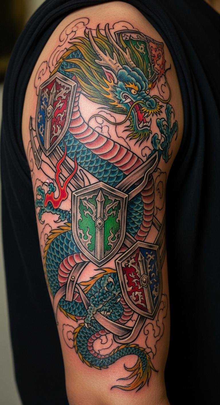 Go big with a sleeve that wraps your arm in dragon glory. It symbolizes ongoing protection and wisdom. Plan it step by step on paper first. Use phone apps for free layout ideas. Opt for phased sessions to spread costs. Bold sleeve patterns to stand out. Choose spots that match your daily outfits. Get stick-on tattoos to preview the effect. Local shops often have sales on supplies. This makes it easy to experiment affordably.