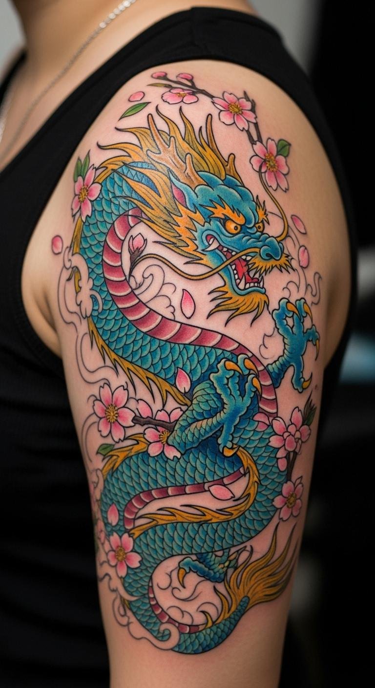 Add cherry blossoms to your dragon for a touch of nature and renewal. It blends beauty with protection. Sketch flowers around the dragon at home. Use apps for free combination ideas. Choose compact designs to save money. Bold blossom elements for flair. Wear tops that frame the area. Test with temporary ink kits. Local fairs might have deals on services. Make it personal without extra cost.