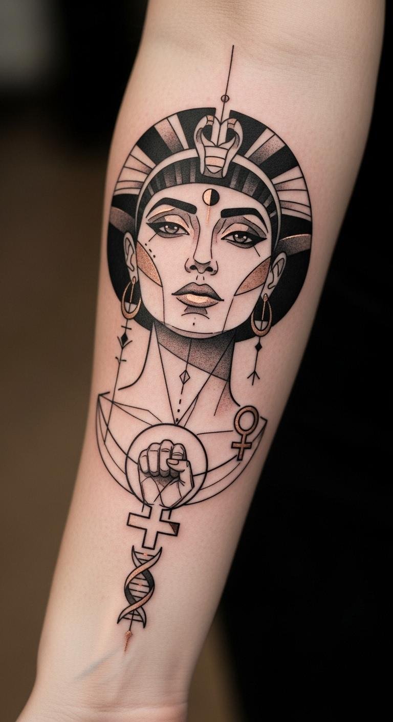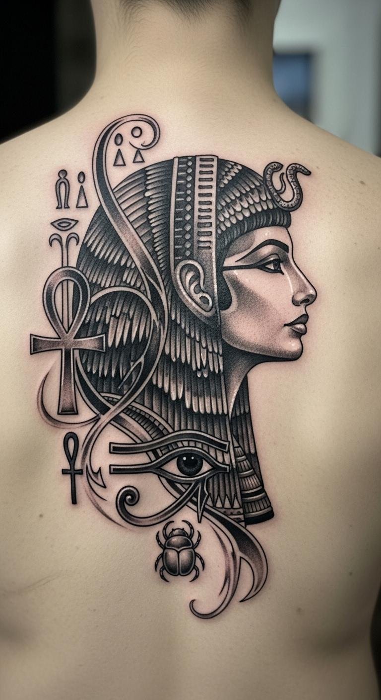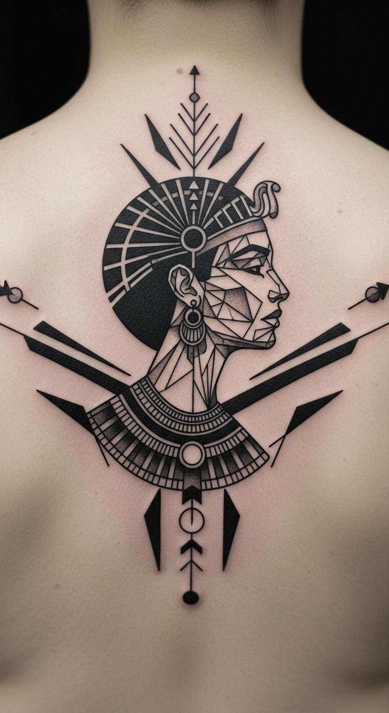 Blend geometric shapes with Cleopatra for a contemporary feel. Start with basic shapes in your sketches. Look for budget artists who mix styles. Put it on your back for a big impact. Use geometric stencils at home to plan. This keeps things stylish and affordable.