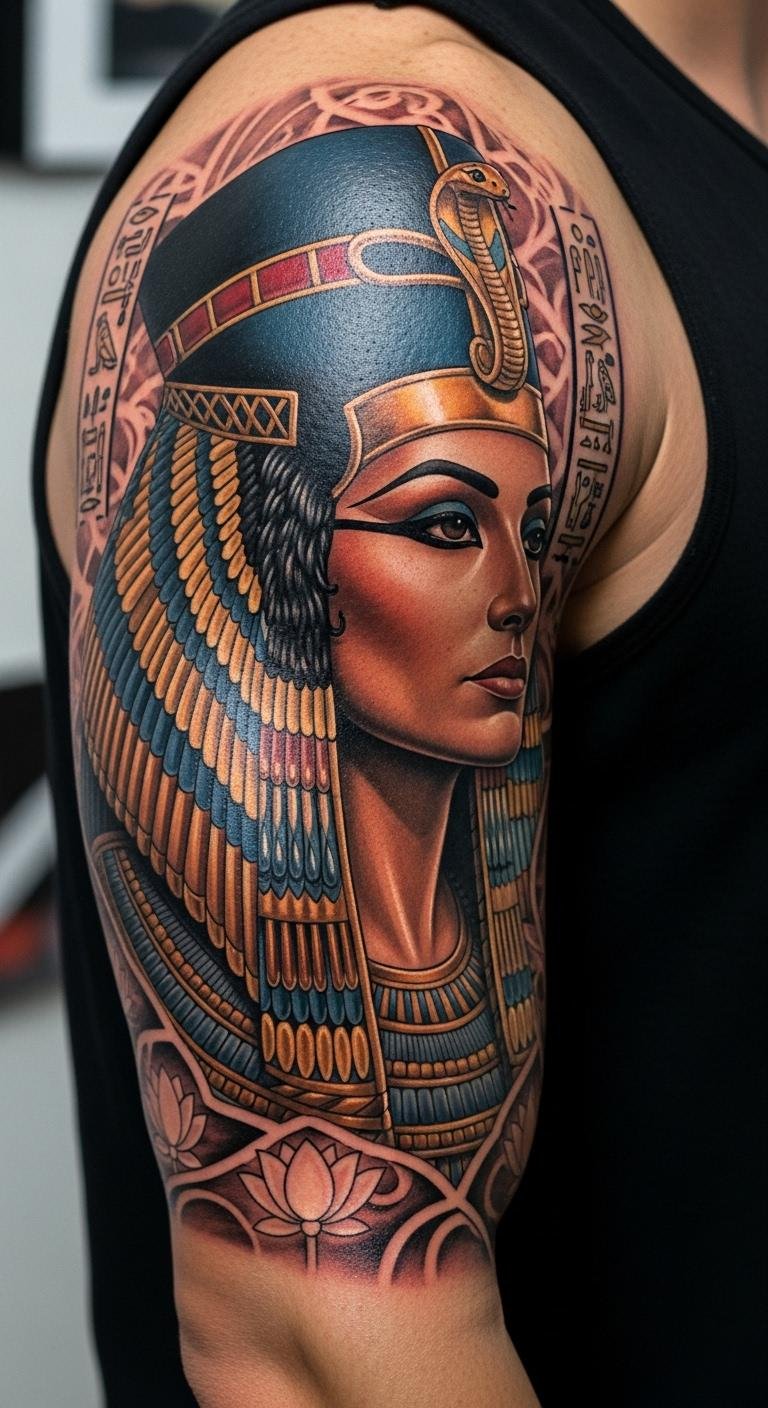 Opt for your upper arm to show off Cleopatra clearly. This spot suits detailed designs. Measure the area with string at home. Shops often suggest placements for free. Add elements that fit the curve. This makes your tattoo practical and visible.