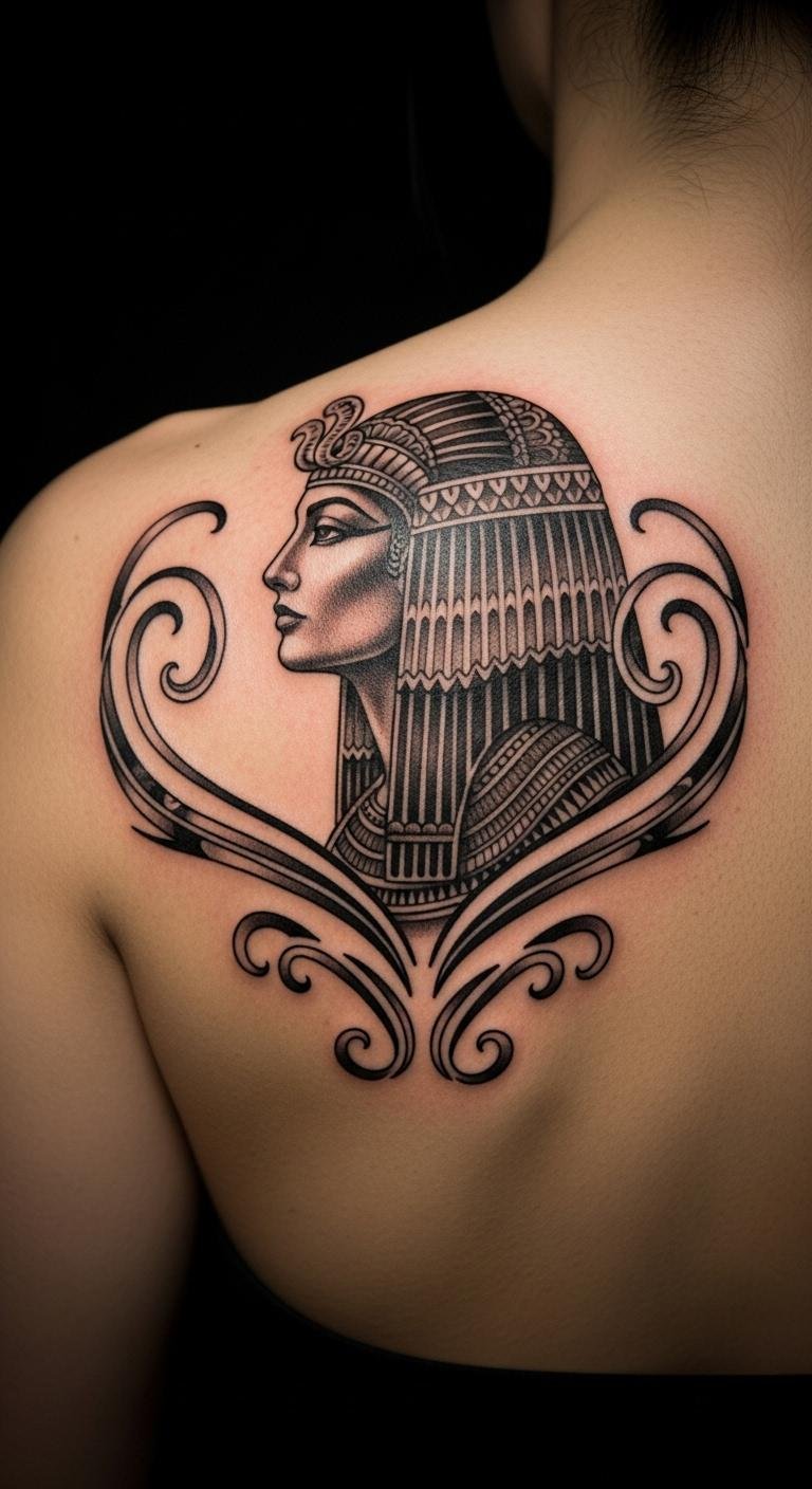 Use your shoulder blade for a balanced Cleopatra tattoo. It hides easily if needed. Sketch templates to match the space. Ask for free advice at studios. Customize with simple additions. This spot keeps things functional and low-cost.