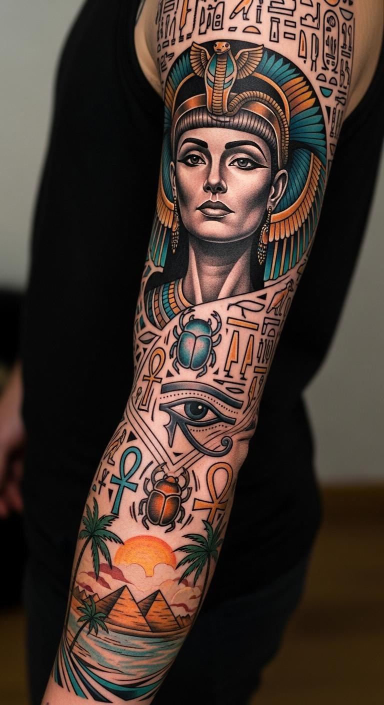 Mix Cleopatra’s image with hieroglyphics for a cultural nod. This setup uses symbols like eyes or waves around her face. Practice by drawing simple glyphs on paper at home. Seek out artists with portfolio shares—some offer low-cost sessions. Place it on your back for a larger, impactful design. Use free apps to combine elements yourself before deciding. This approach makes your tattoo unique without breaking the bank.