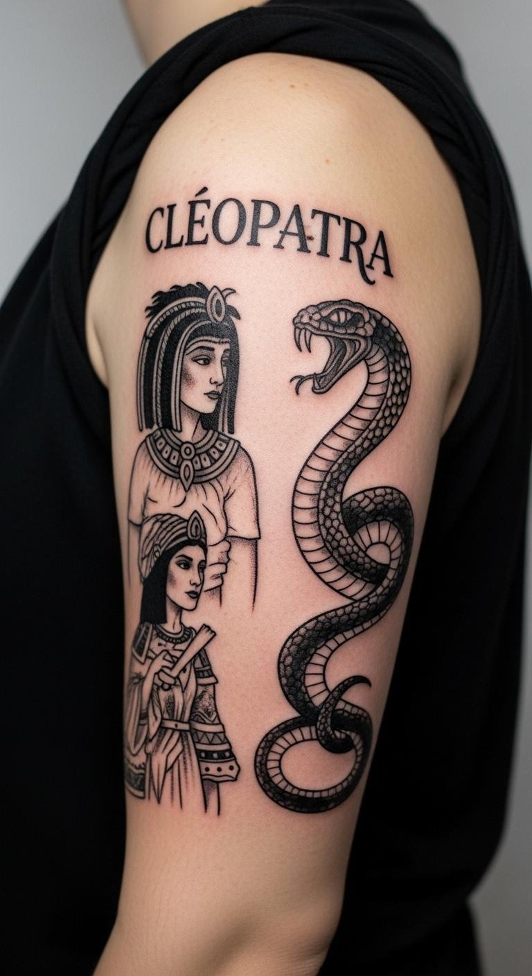 Picture Cleopatra holding an asp snake to symbolize her story. This design adds a touch of drama with just a few lines. Sketch it out on your skin with washable markers first to get the feel. Find budget-friendly artists online who focus on symbolic tattoos. Put it on your shoulder for easy cover when needed. Add a personal twist, like a small flower next to the snake, using free drawing tools. This idea keeps things affordable and lets you tell your own tale.