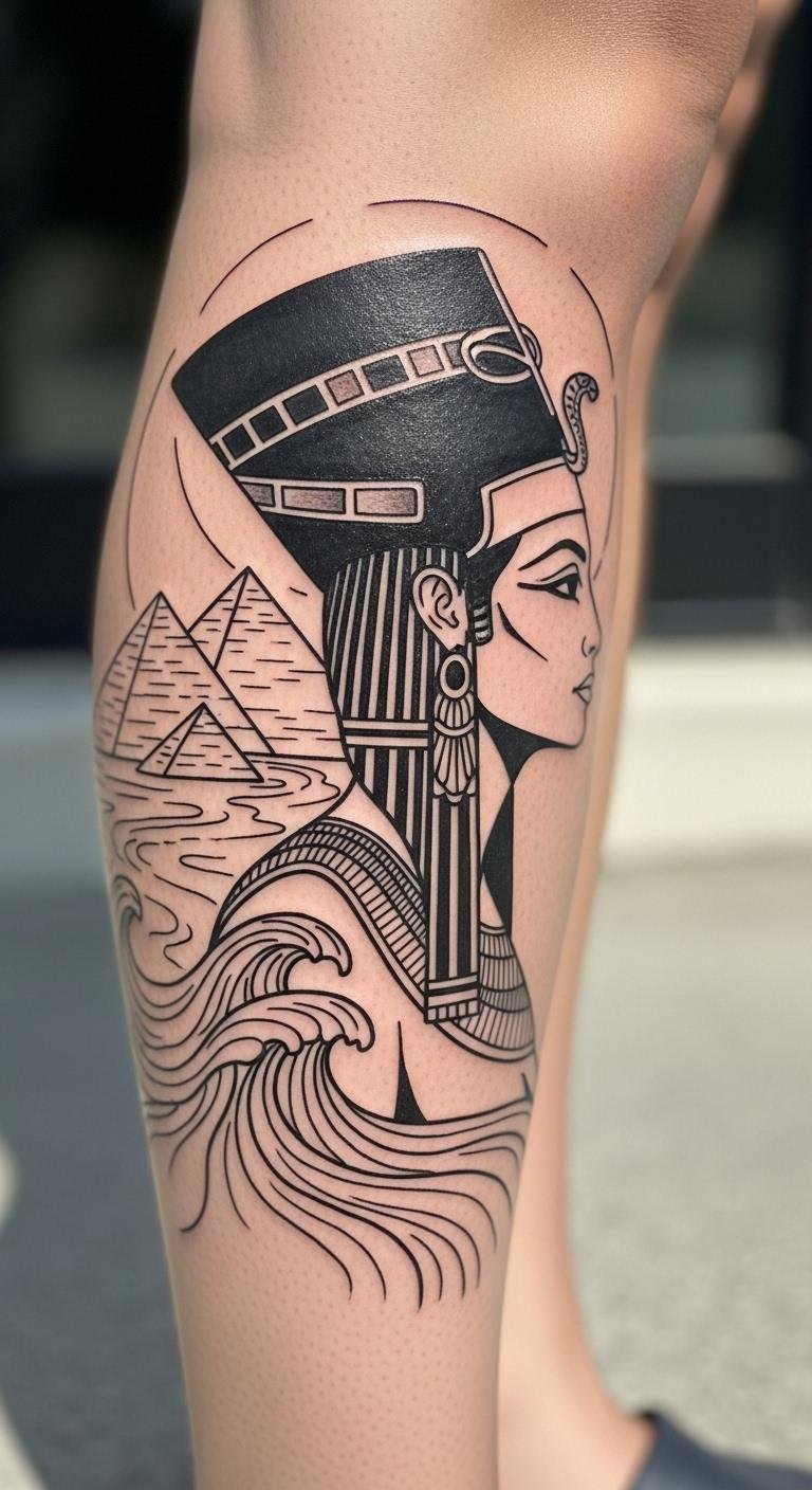 Incorporate pyramids and the Nile to bring in Egyptian scenery. This adds background elements around Cleopatra. Sketch the scene on paper to visualize it. Find deals at local fairs for such tattoos. Place it on your calf for movement and fun. Use basic art supplies to add your touches. This idea makes your tattoo story-rich without high costs.