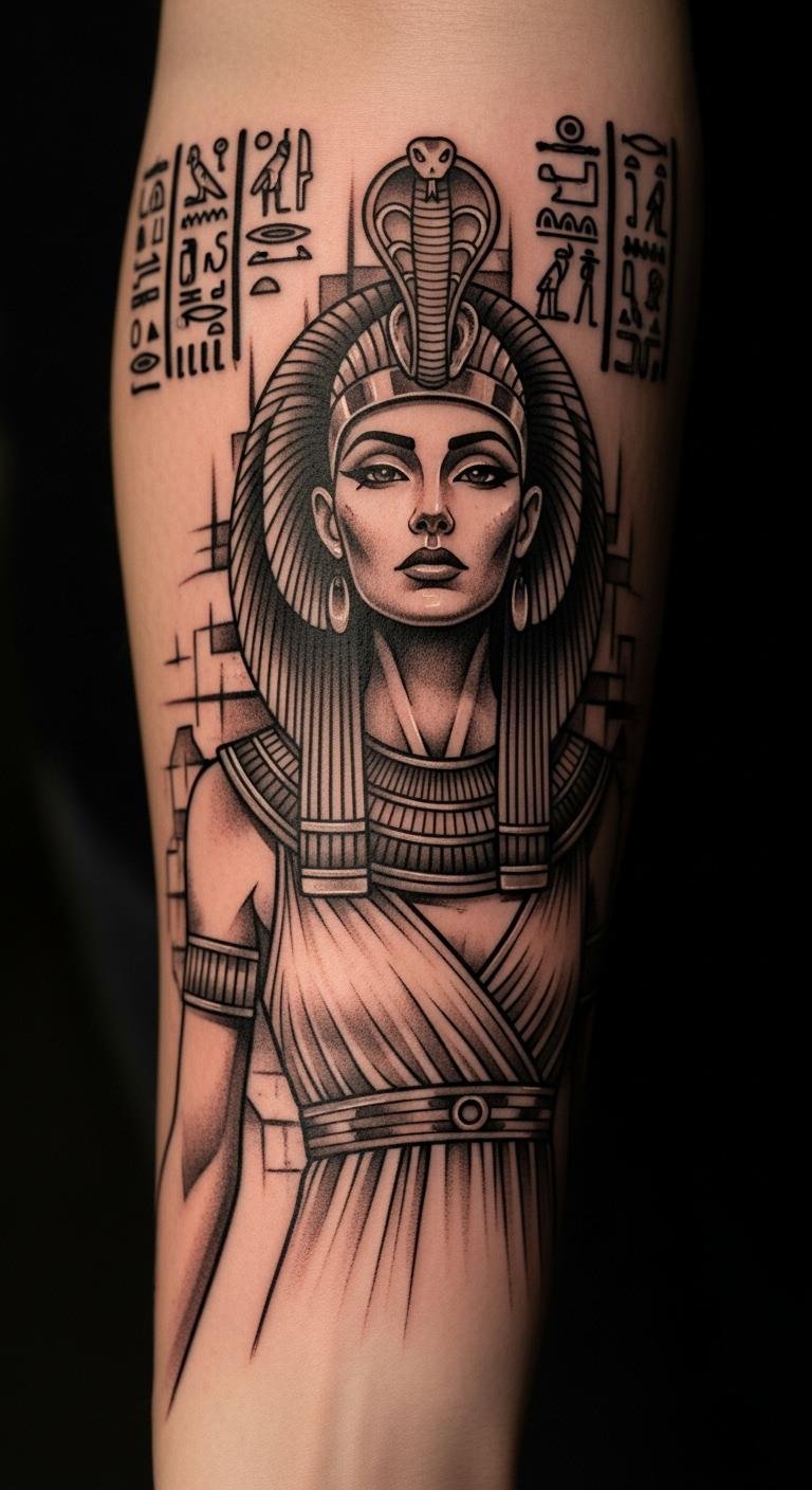 Show Cleopatra in a strong pose to represent inner power. Keep the design straightforward with key lines. Practice poses with sketches at home. Artists often have packages for motivational tattoos. Put it on your forearm for easy inspiration. Customize with symbols using free tools. This helps you feel empowered on a budget.