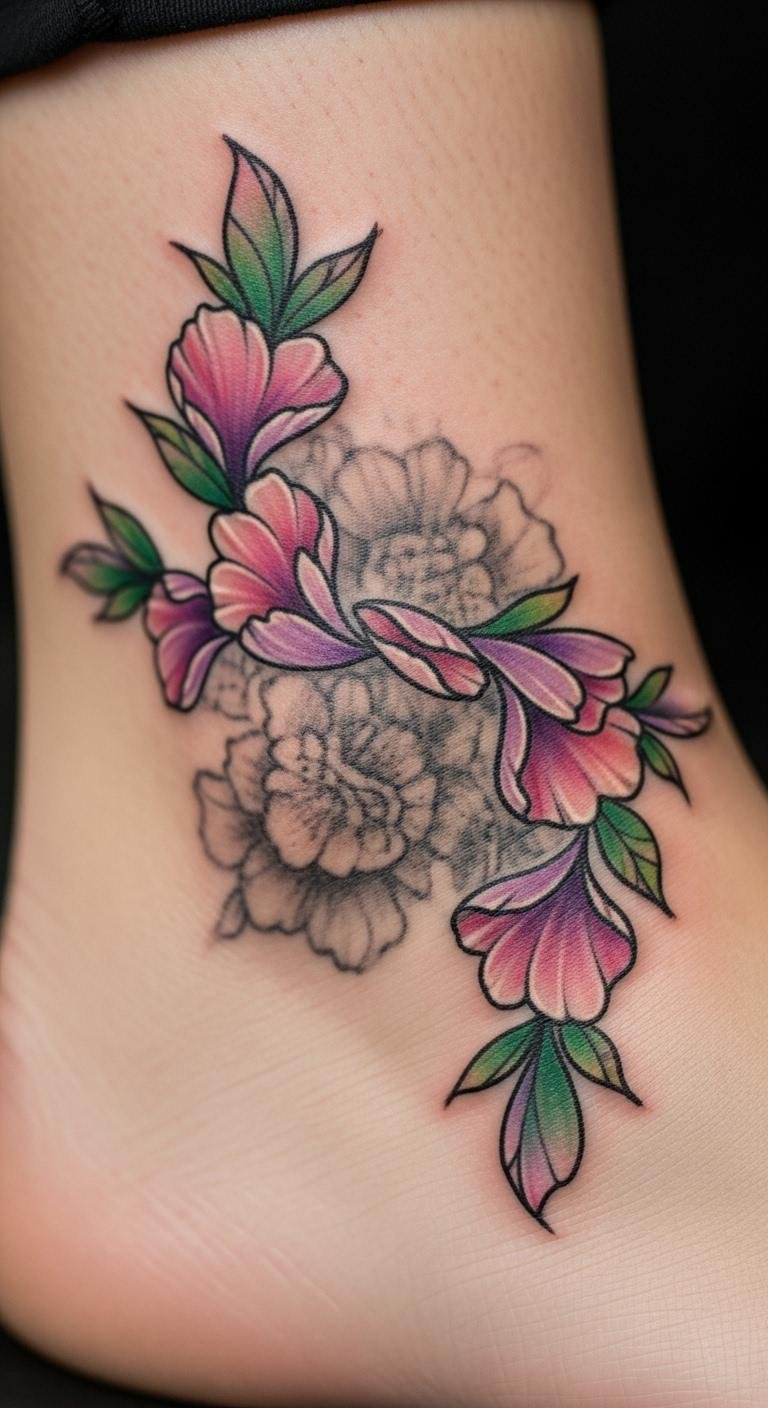 Floral designs soften old tattoos. Add flowers for a gentle cover. Try on your ankle. Costs around $100. Sketch blooms at home.