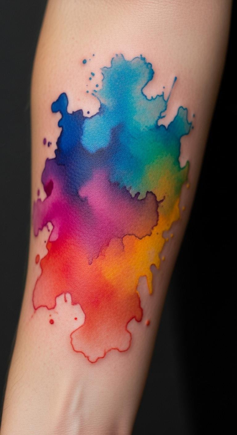 Watercolor blends mask tattoos colorfully. Layer paints for effect. Start on your forearm. Expect $130. Mix colors on paper.