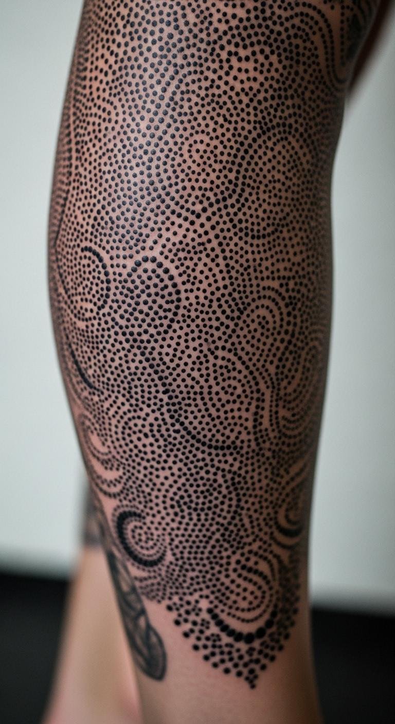 Dotwork patterns conceal tattoos. Build dots for design. Start on your calf. Artists charge $110. Practice dotting at home.