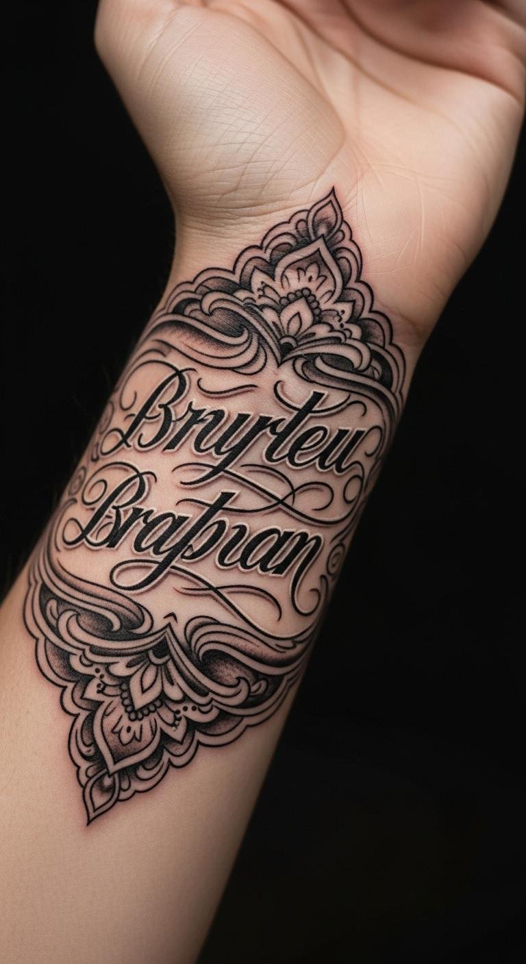 Script lettering covers tattoos. Write new words over old. Begin on wrist. Costs around $90. Practice handwriting.