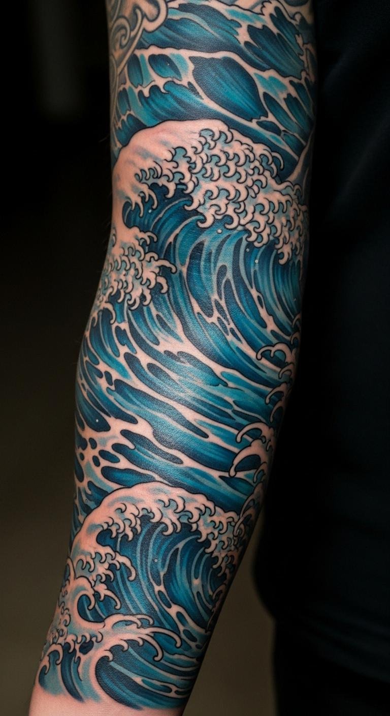 Ocean waves hide tattoos fluidly. Use waves for blend. Start on arm. Expect $140. Draw waves simply.