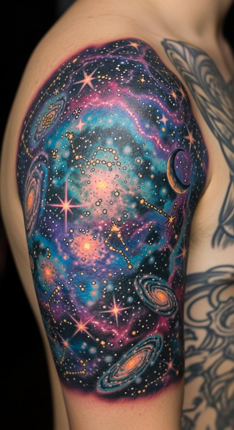 Space themes reinvent tattoos. Add stars for cover. Try on shoulder. Artists offer for $160. Sketch space scenes.
