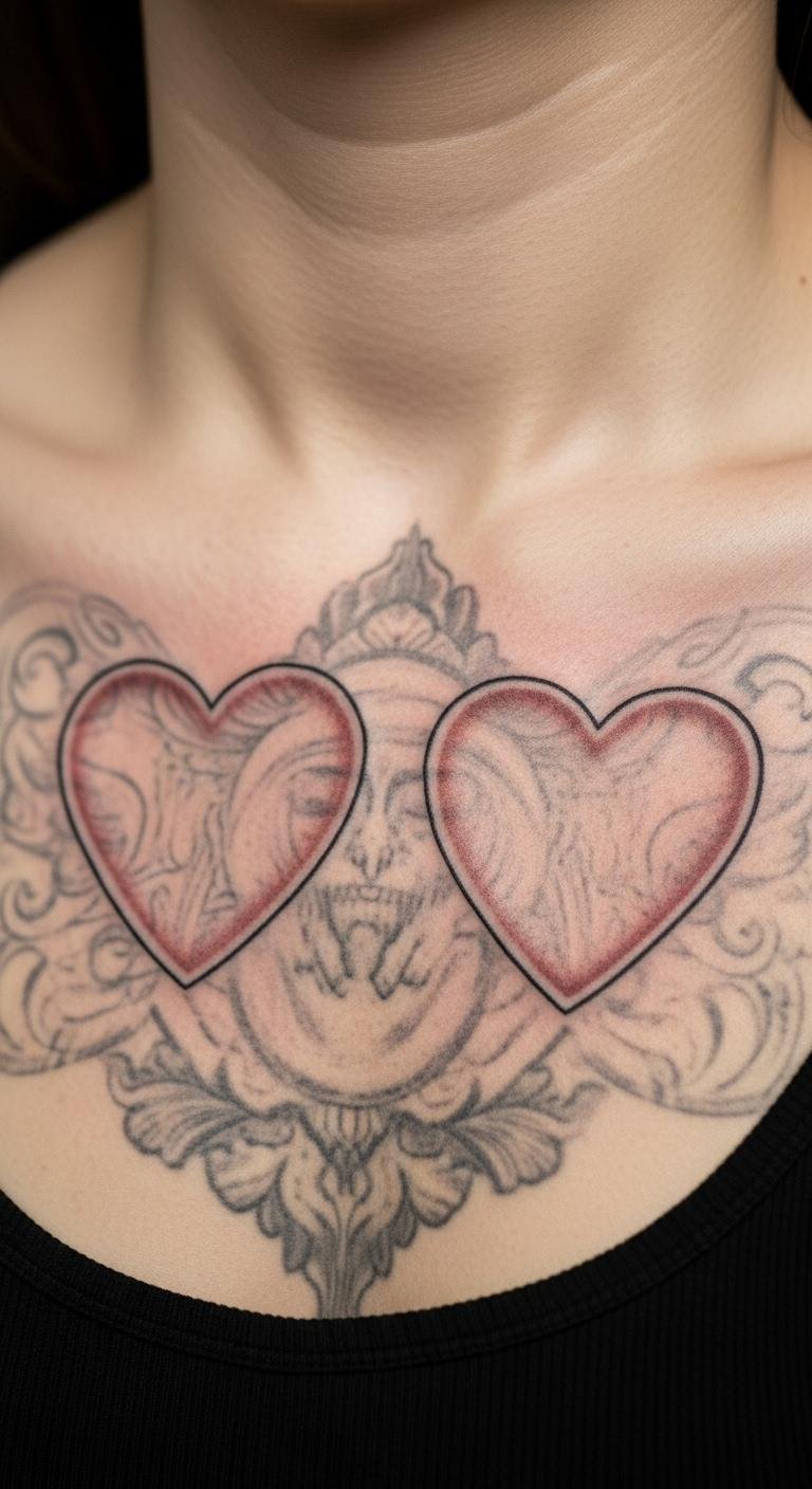 Heart shapes cover tattoos emotionally. Layer hearts for hide. Start on chest. Expect $100. Draw hearts quick.