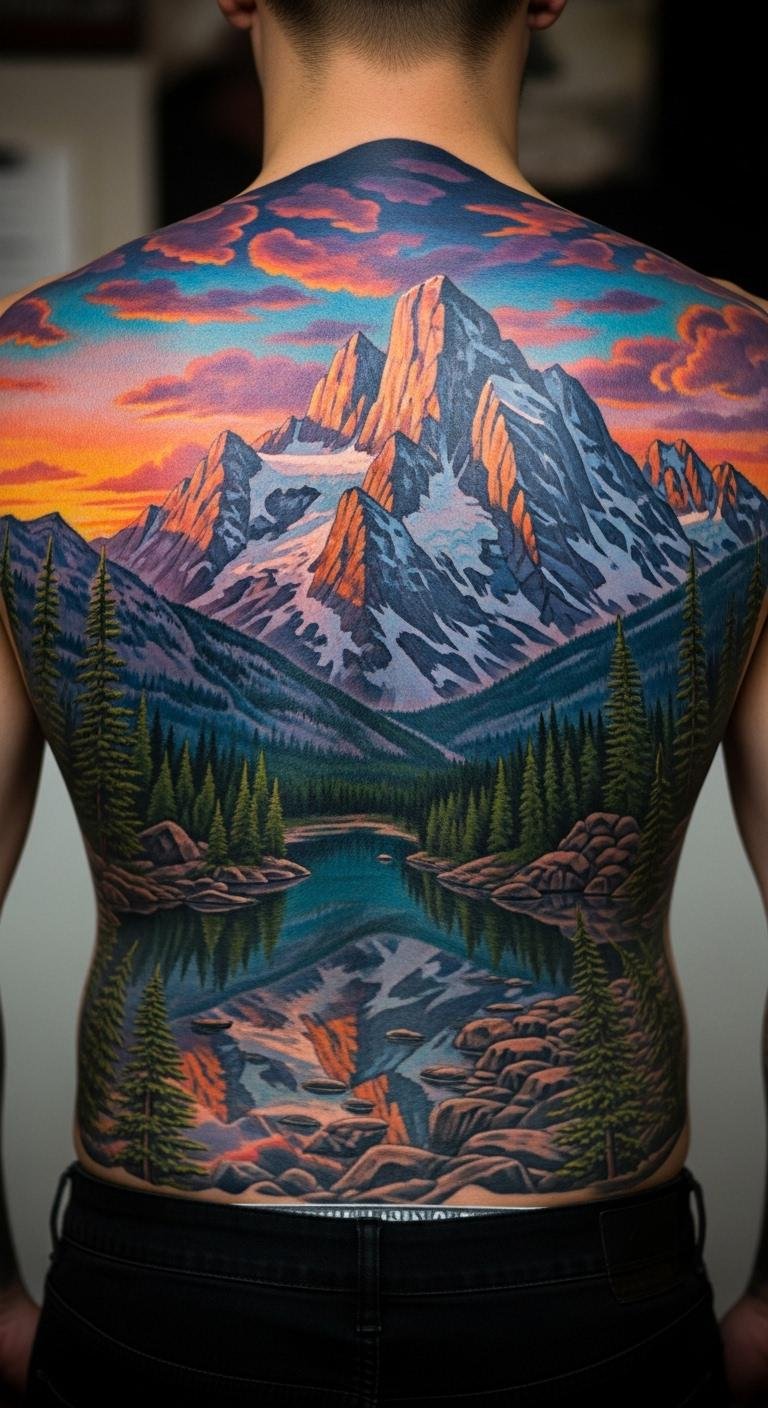 Mountain landscapes hide tattoos grounded. Use peaks for cover. Try on back. Artists charge $170. Sketch landscapes.