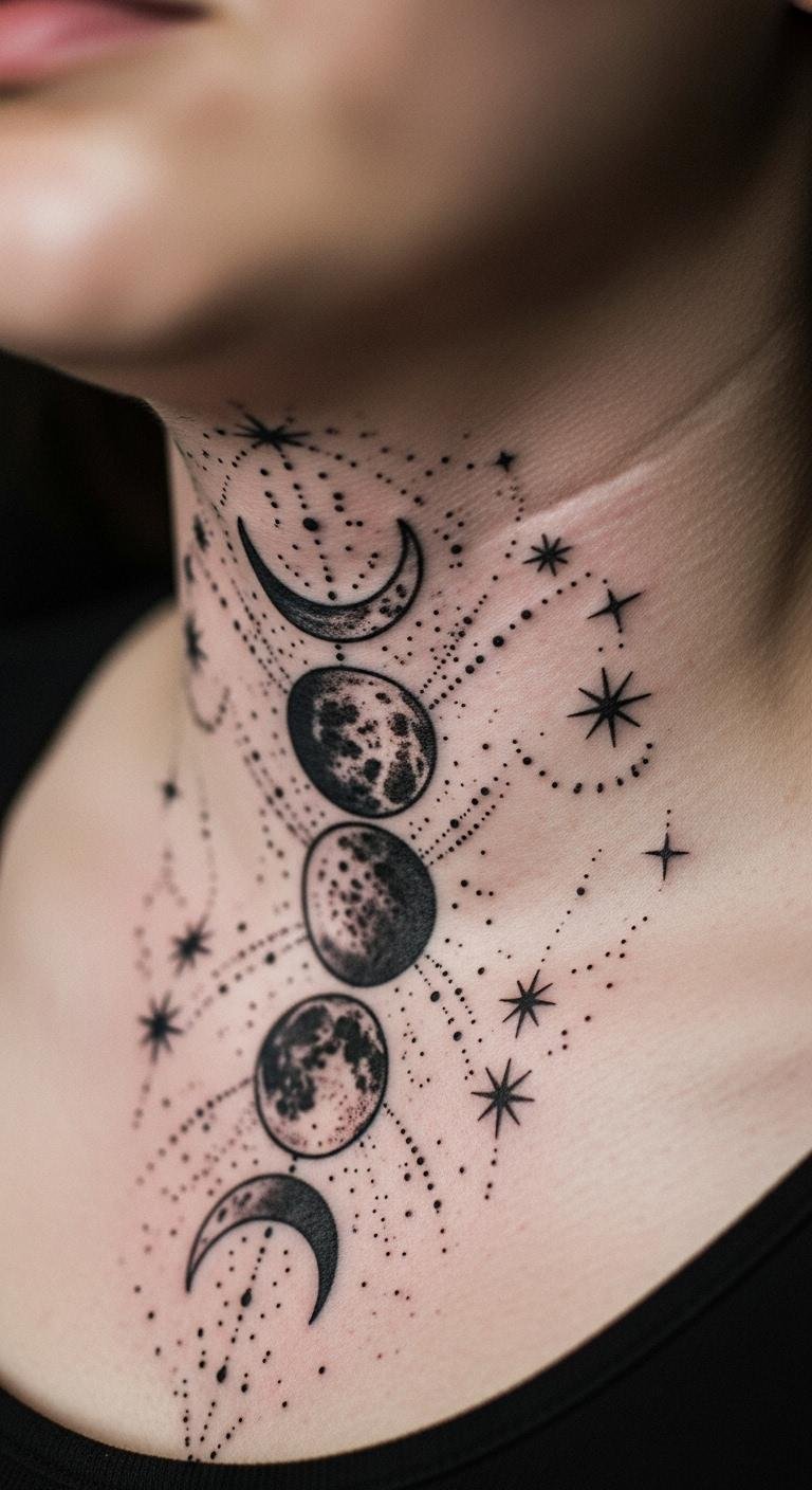 Celestial bodies mask tattoos starry. Add moons for cover. Try on neck. Artists offer for $110. Draw stars simply.