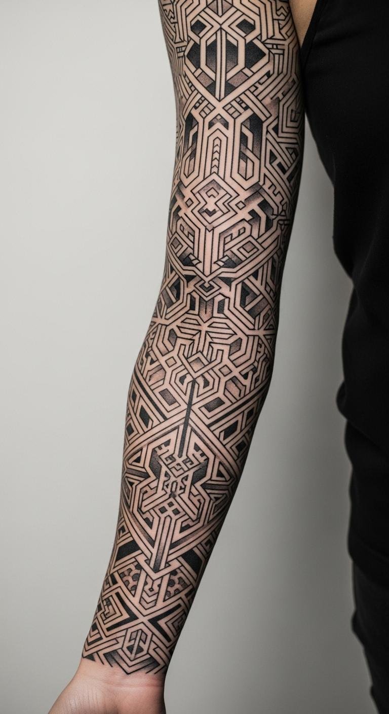 Geometric shapes offer full coverage. Use triangles to hide everything. Try on your arm. Artists charge about $200. Plan with graph paper. This creates a clean look.