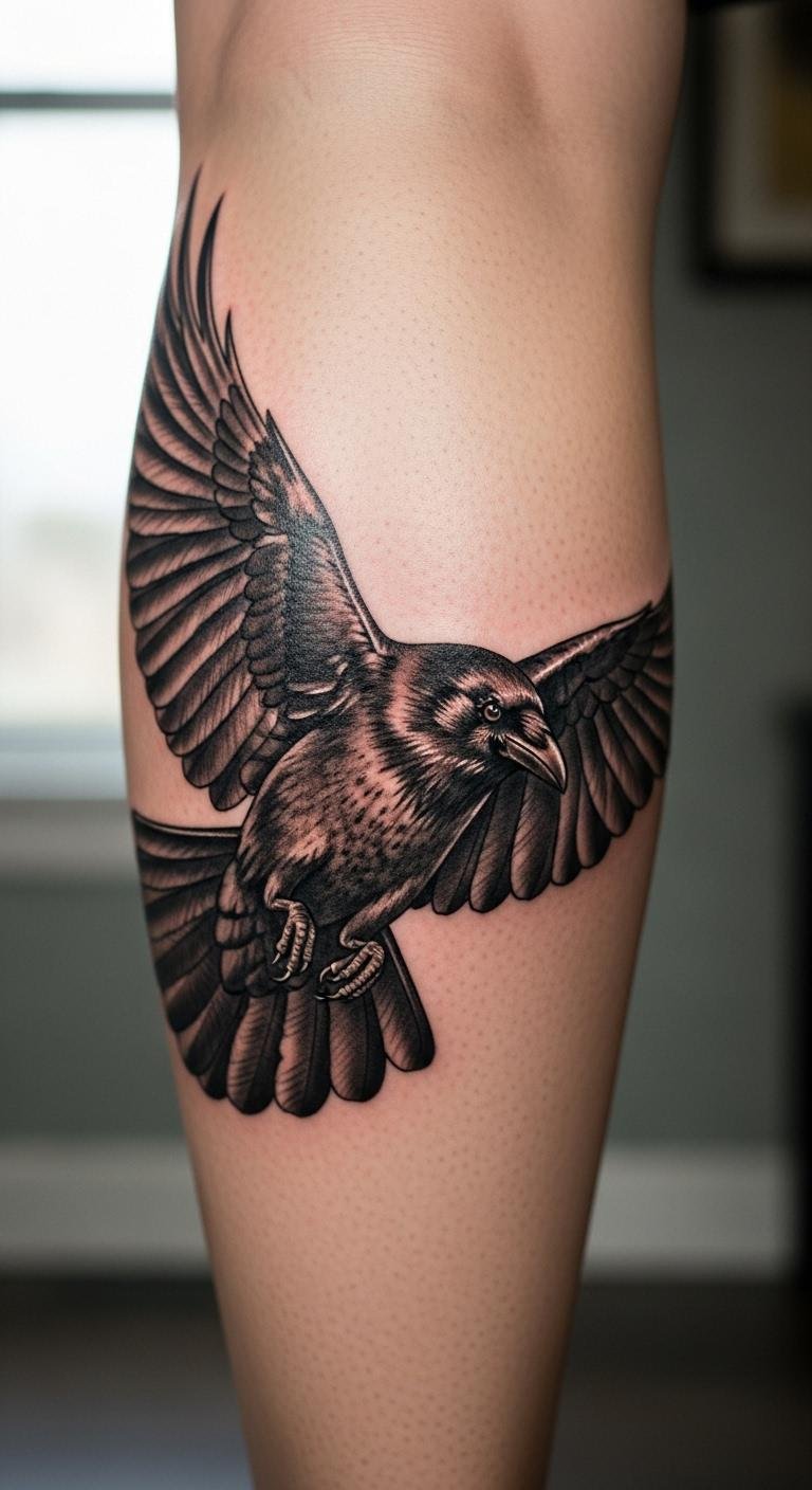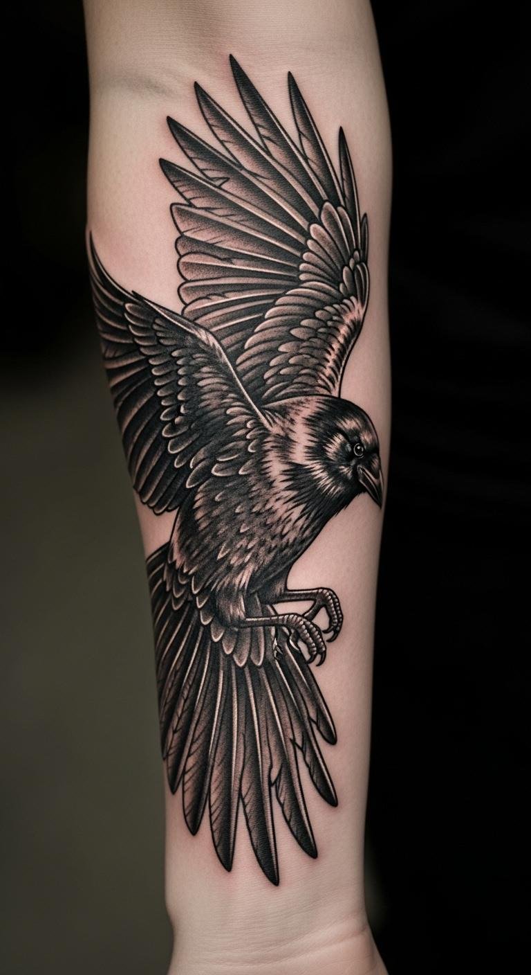 Imagine a crow soaring across your skin, wings spread wide. This idea brings energy through detailed feathers that flow naturally. Sketch it at home using a mirror and pencil for placement. Save money by printing free reference images online and practicing the design on paper first. Opt for a medium size to keep it affordable. Add depth by incorporating your favorite color, like a subtle grey wash, but stick to local ink supplies. Real example: use household items like a sharpie to mock it up on your body. This helps you see how it moves with you. Focus on the feathers’ edges for a lifelike feel. It’s an easy way to symbolize freedom without breaking the bank. End with basic care tips, like covering it with a cheap bandage.