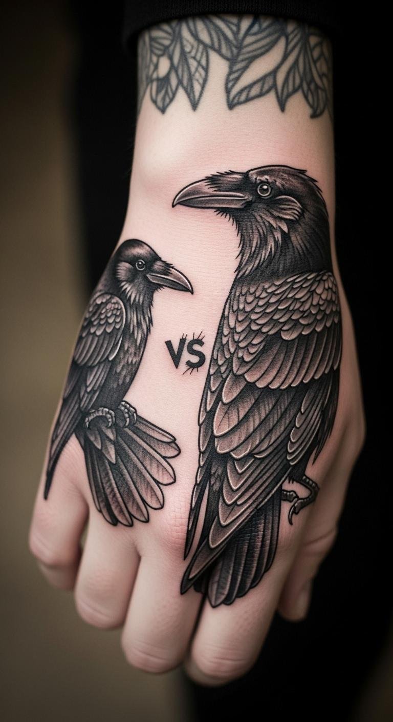 Think of a design highlighting crow traits over raven. This mixes features for a unique twist. Compare images online and draw hybrids. Keep it low-cost with basic sketches. Place it on your hand for visibility. Real tip: swap details in a drawing app. Add clever eyes for the crow. This clarifies choices economically. Focus on differences. It’s helpful and straightforward. Seal with simple products.