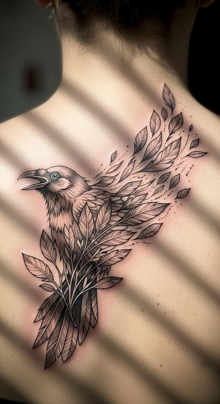Think of a crow bursting from a tree for change vibes. This idea blends branches into wings. Sketch trees from your yard for inspiration. Save by keeping the design outline-based. Place it on your leg for movement. Real DIY: use leaves to trace patterns. Add emerging feathers for drama. This symbolizes growth affordably. Keep lines fluid. It’s inspiring and easy. Use simple lotions post-ink.