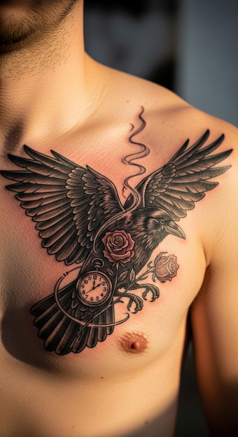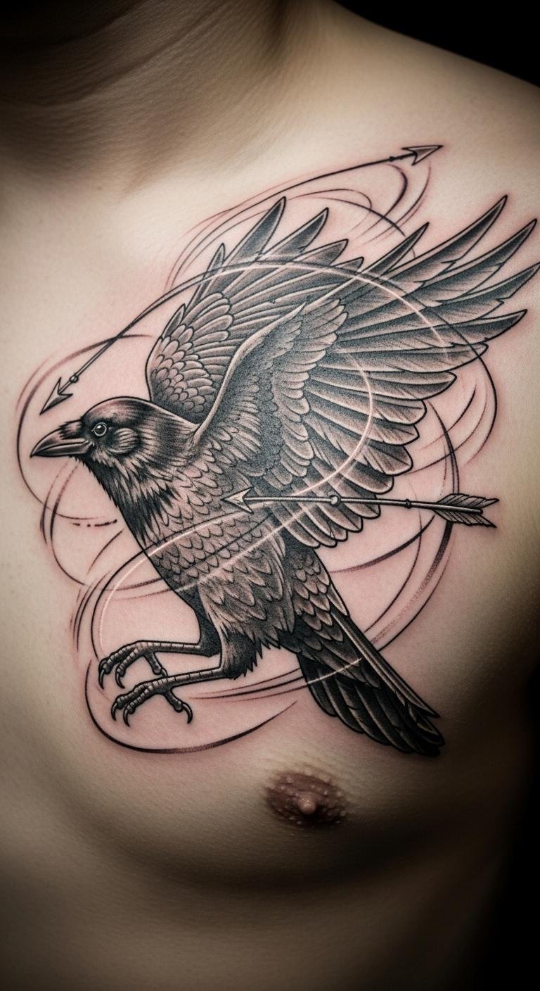 Picture a crow leading the way on your chest. This design adds arrows or paths to represent guidance. Sketch ideas from nature walks and note them down. Save money by using recycled paper for drawings. Pick a central spot for impact. Real DIY: draw faint lines with eyeliner to test it. Personalize with a small path under the bird. This makes it a protector symbol affordably. Keep details minimal for quick sessions. It’s empowering and simple. Follow with basic hygiene products.
