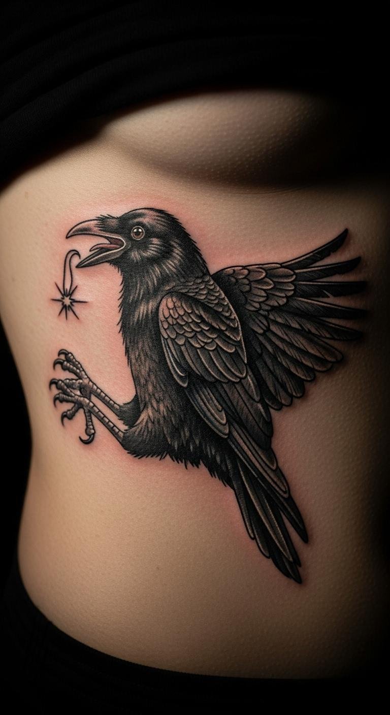 Think of a crow looking sly and fun. This design curves the beak into a smile. Draw cartoons for ideas. Cut costs with playful lines. Choose your rib for secrecy. Real example: add a wink eye. This represents resilience economically. Focus on humor. It’s light-hearted. Use simple aftercare.