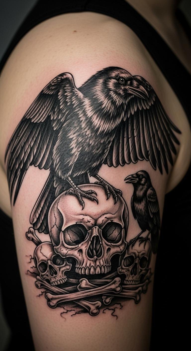 Envision a crow on a skull for depth. This pairs them tightly. Find skull images online for free. Cut costs with shared elements. Choose your shoulder for strength. Real example: overlap drawings. Add feathers on the skull. This layers meanings affordably. Keep it balanced. It’s intense. Protect with simple wraps.