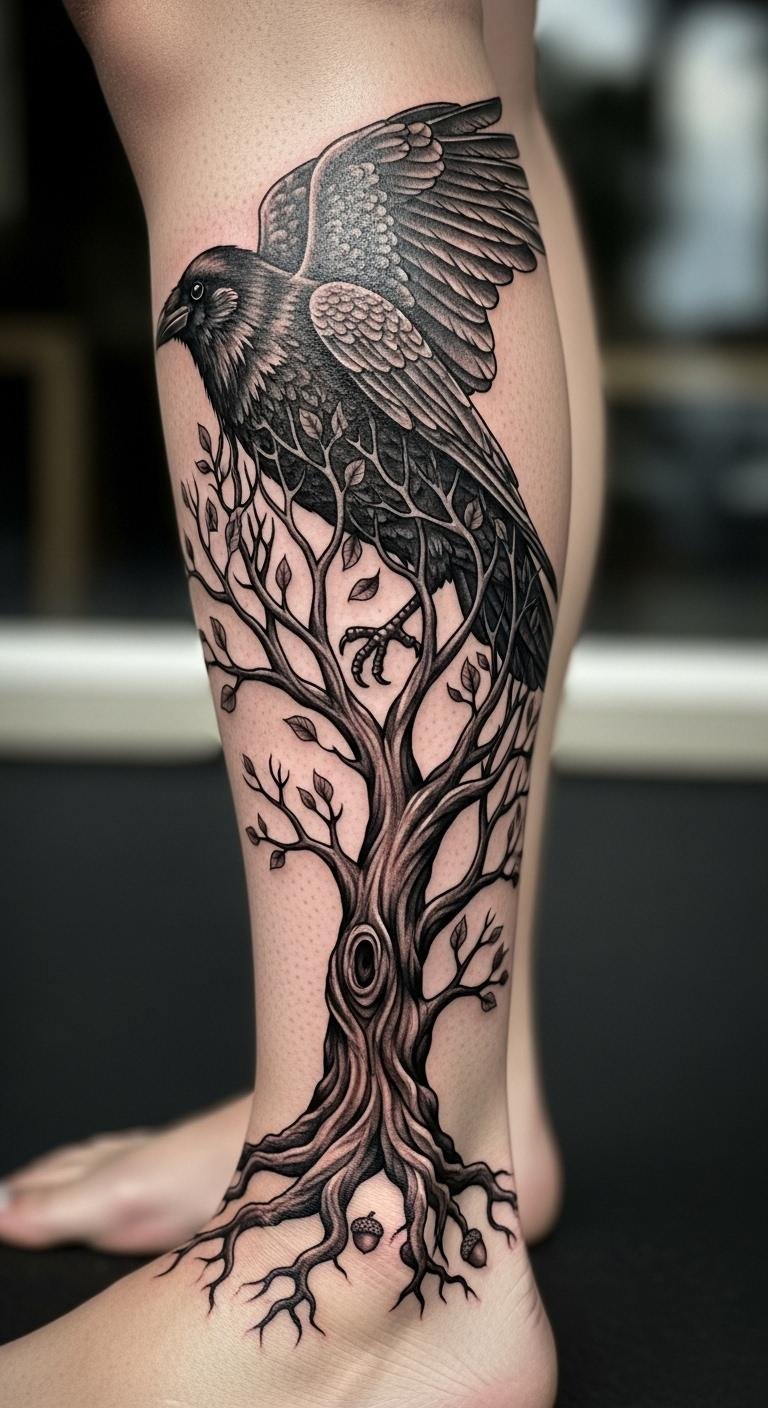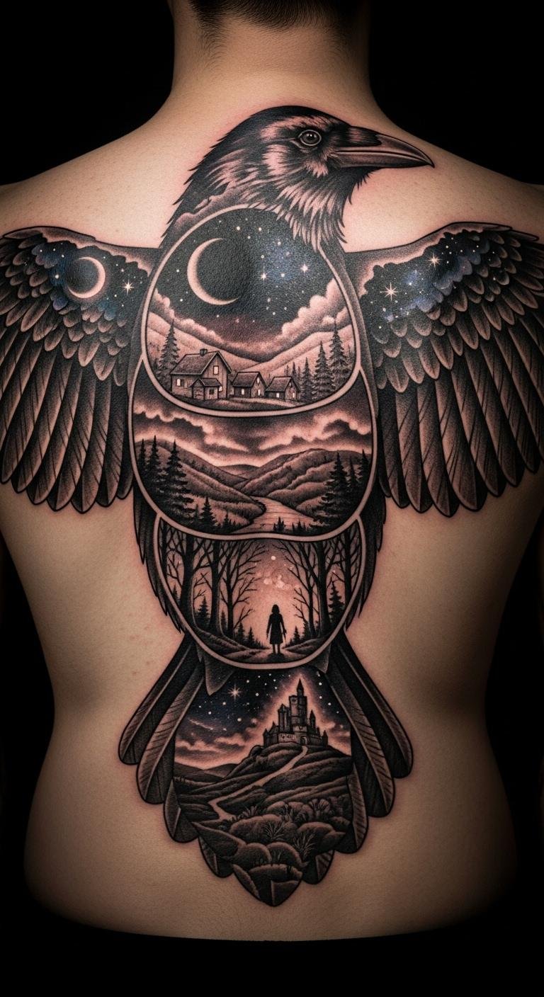 Story-Layered Crow Tattoo