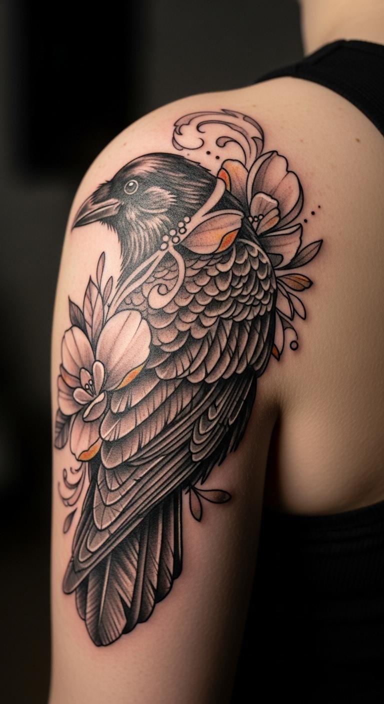 See a crow dotted with flowers for balance. This style adds petals to soften the bird. Draw flowers from your garden photos. Cut costs with minimal added elements. Choose your shoulder for grace. Real tip: press real flowers to plan the layout. Make the blooms match the crow’s tail. This creates harmony on a budget. Focus on simple overlaps. It’s versatile and fun. Maintain with household creams.