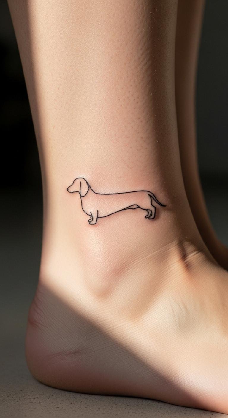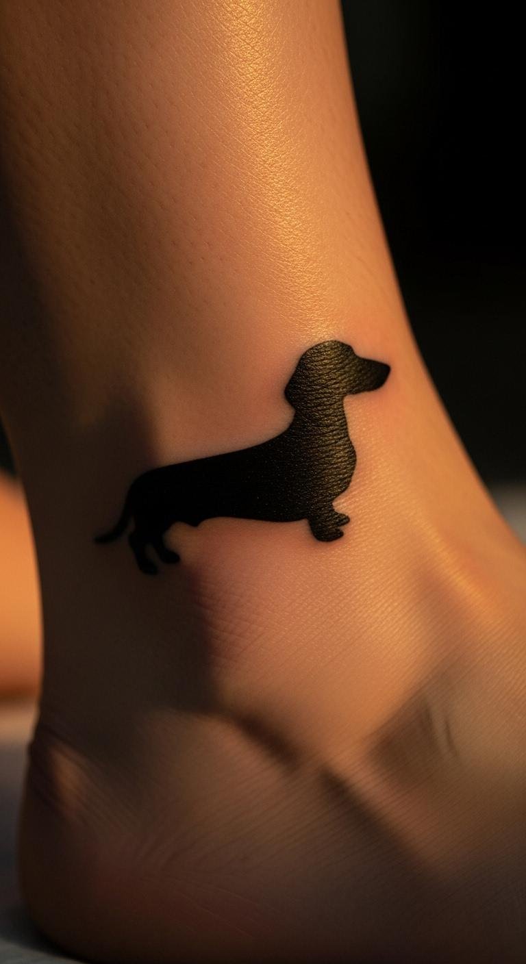 Silhouettes are sleek. A shadow dachshund simplifies. Shadow practice. Ankle spot. Under $80. Keep it dark. Add if wanted. Fast work. Watch fading. This is elegant. Find shadows.