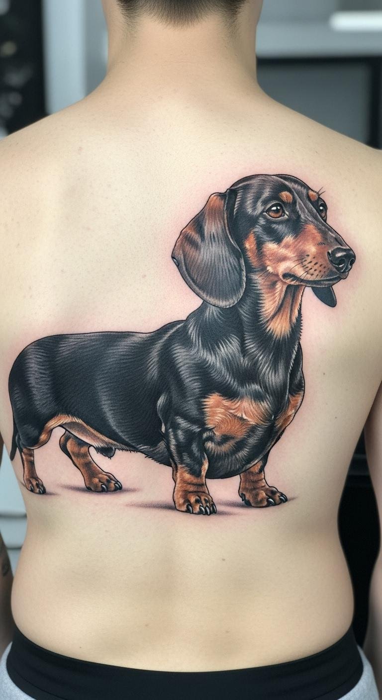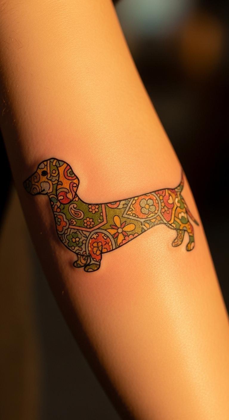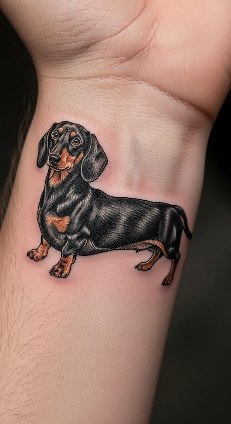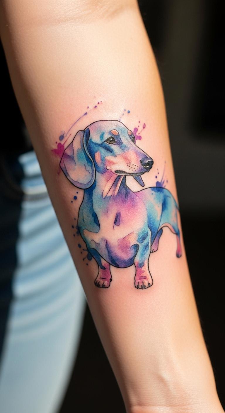 Watercolor adds soft colors for a dreamy vibe. A pastel dachshund uses light blues and pinks to mimic paint splashes. Draw it at home with markers first. Aim for an arm spot to show it off. Prices start around $150 for small ones. Choose vegan inks if you care about the planet. Mix in flowers for more fun. Ask your artist for color tests. This style heals fast with basic lotion. Share photos online for inspiration. Keep costs down by skipping extras. Your tattoo becomes a colorful memory.
