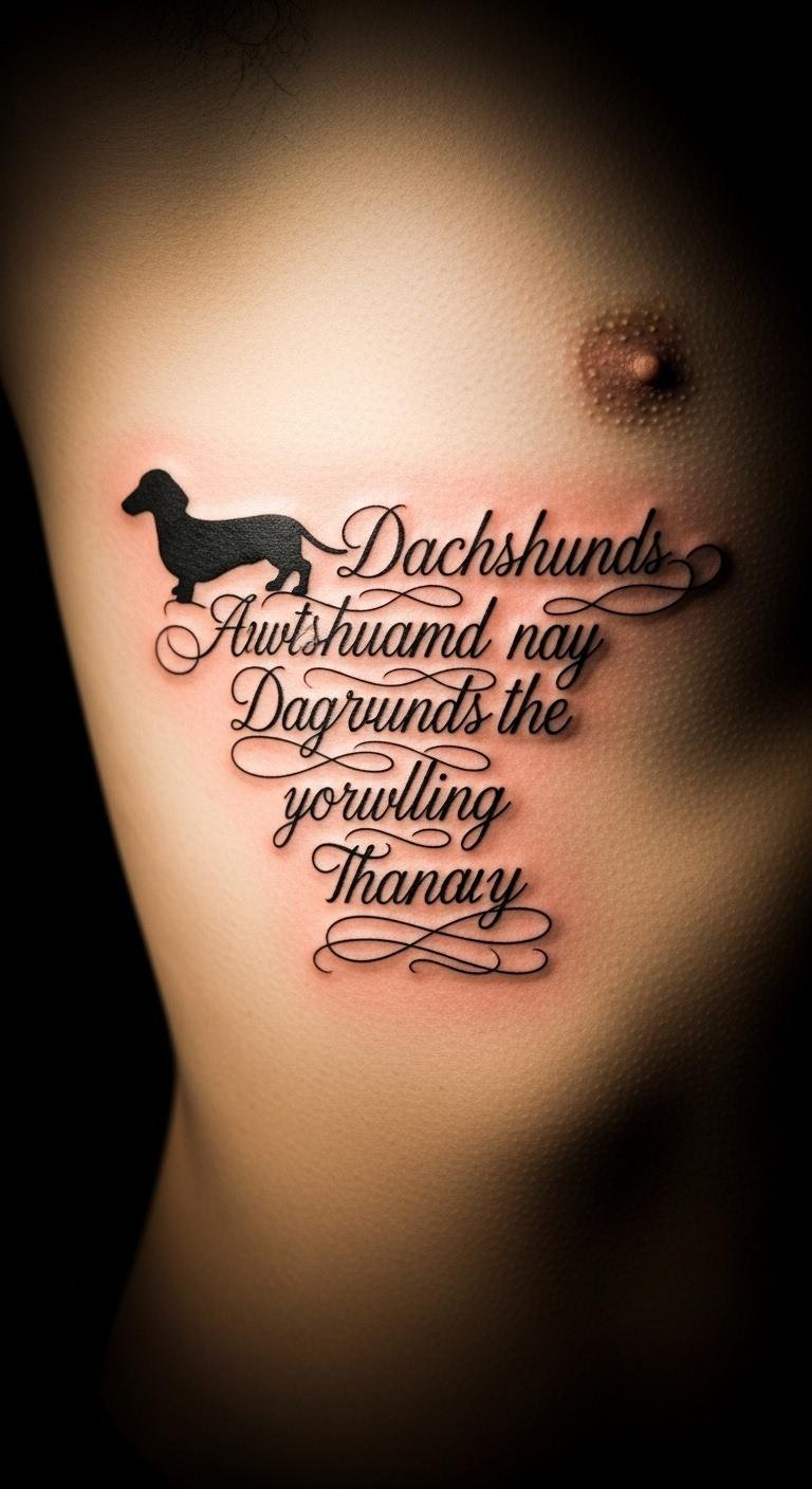 Words add depth easily. A quoted dachshund combines text and art. Practice handwriting. Go for ribs if private. Under $180. Pick clear fonts. Integrate smoothly. Expect quick work. Moisturize regularly. This inspires daily. Save on simple quotes.