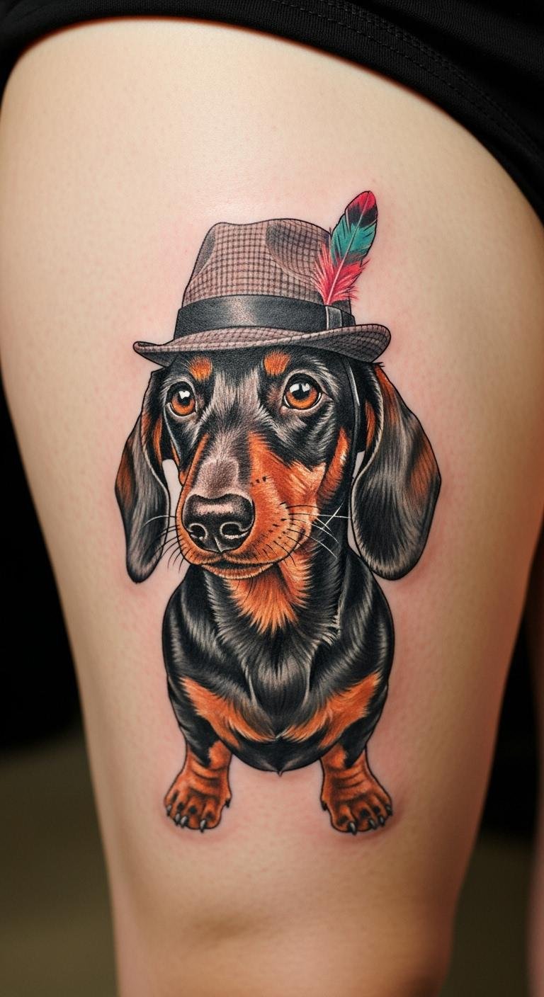 Hats make it playful. A hatted dachshund adds humor. Draw cartoons for fun. Choose thigh for space. Prices at $110. Add accessories wisely. Laugh through it. One visit works. Care with fun. This brings smiles. Budget creatively.
