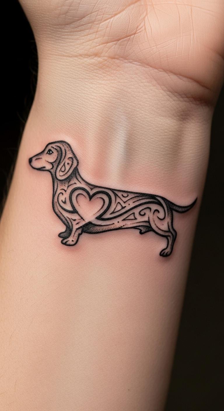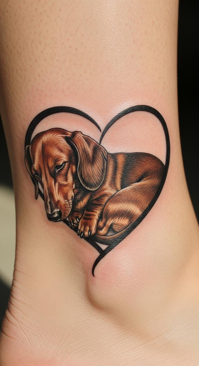 Hearts show affection. A wrapped dachshund expresses love. Sketch hearts first. Ankles work well. Around $90. Pair with names. Keep it tender. One appointment. Care daily. This warms hearts. Budget for love.