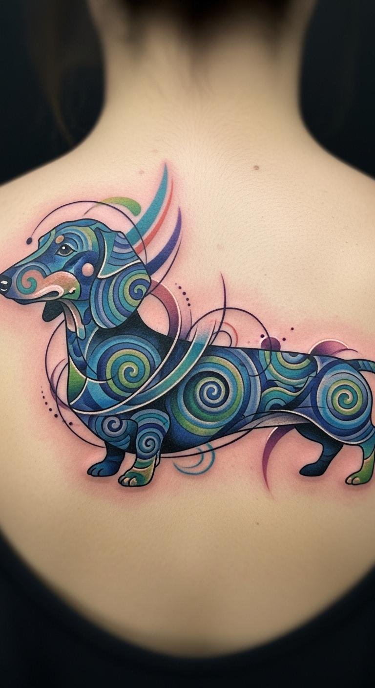 Abstract offers creativity. A swirling dachshund experiments with forms. Use apps for designs. Place on back. Costs $140. Blend elements. Discuss with experts. Heal patiently. This is unique. Save on materials.