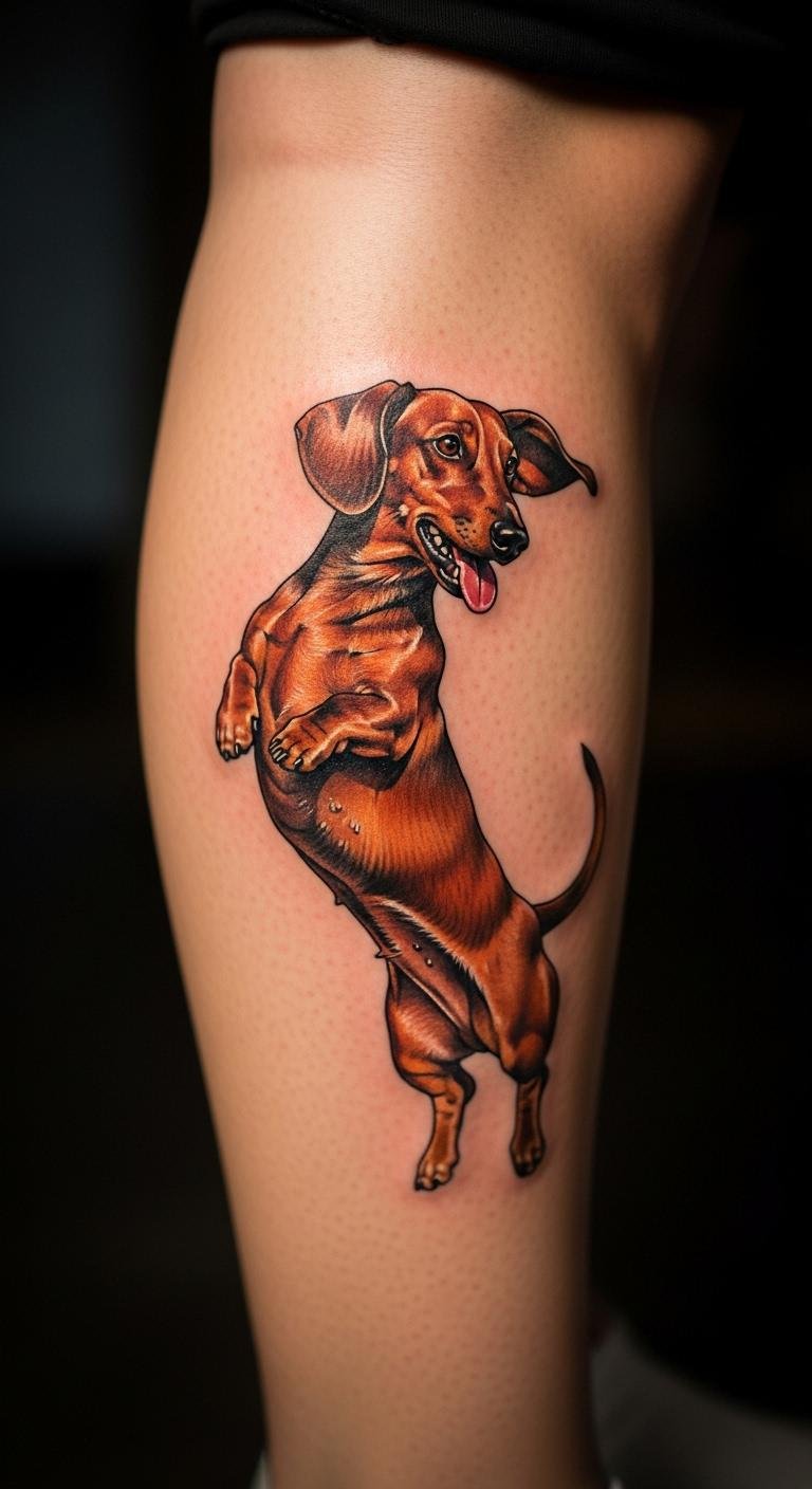 Black keeps it straightforward. A basic dachshund relies on ink alone. Doodle on skin first. Place on calf for style. Costs less than $90. Stick to classics. No extras needed. Finish in hours. Watch for fading. This one is reliable. Try local spots.