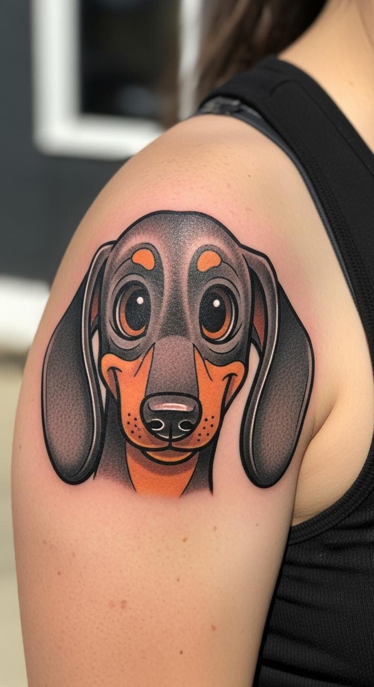 Go cartoon for a lighthearted twist. A dachshund face with big eyes brings smiles. Sketch it quickly with a phone app. Place it on your shoulder for cover options. Expect to pay under $200. Use simple tools like pencils for planning. Add glasses for personality. Find budget artists through reviews. It takes one visit. Protect it with sunscreen later. This design fits casual vibes. Try it as a group activity. Your ink will spark fun talks.