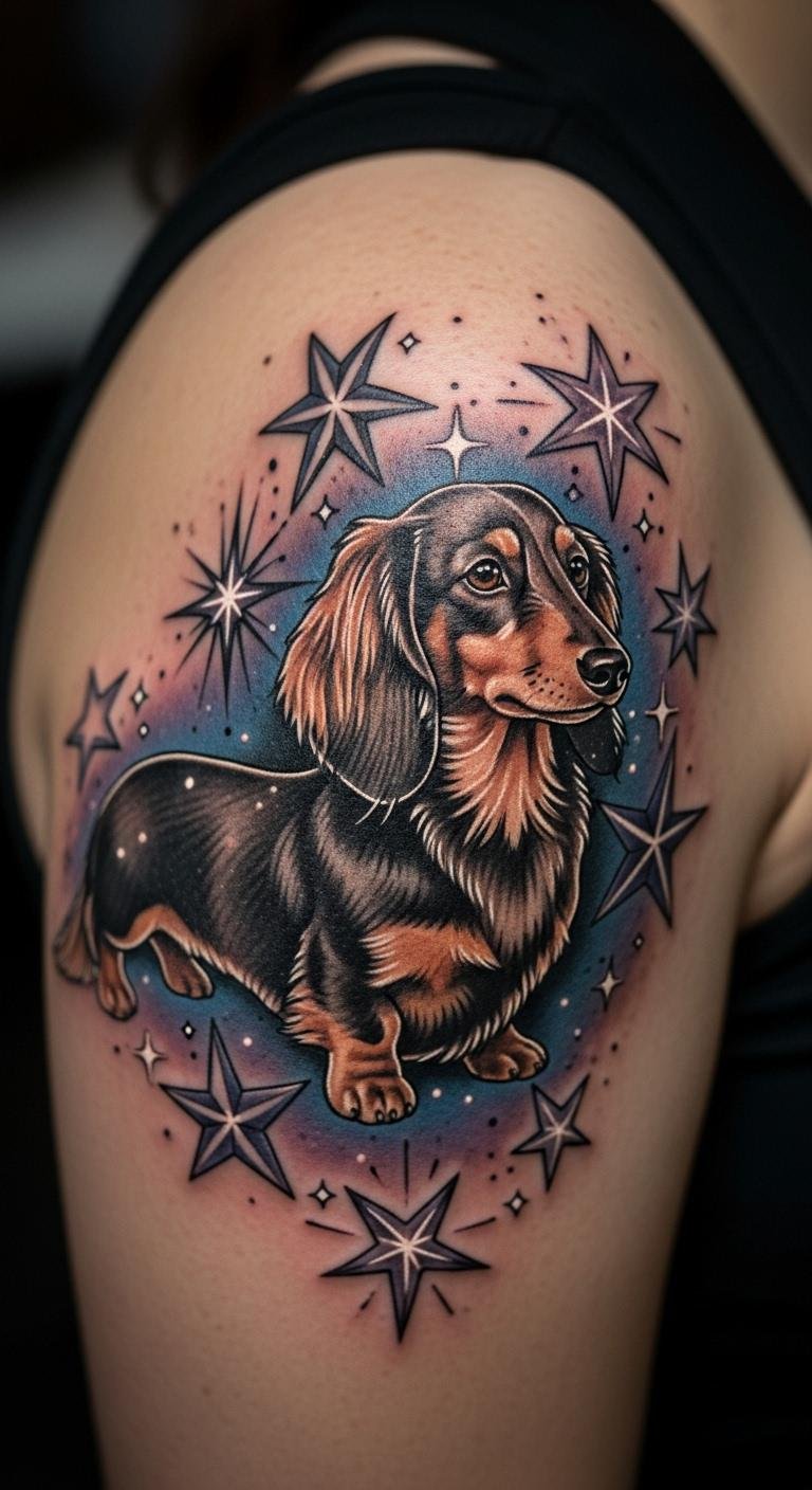 Stars add wonder. A starry dachshund dreams big. Draw stars simply. Shoulder for stars. About $130. Use night themes. Integrate stars. Quick session. Protect from wear. This shines. Find star ideas.
