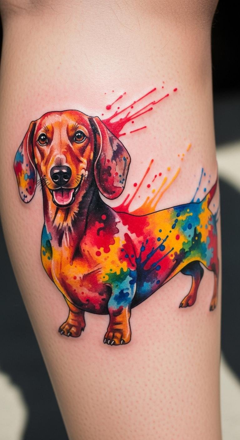 Bright hues bring energy to skin. A splashed dachshund pops with colors. Experiment with paints at home. Go for a leg to display it. Around $200 total. Opt for durable inks. Blend in stars if you like. Get advice on fading. Use cream for care. This design cheers you up. Find affordable artists nearby.