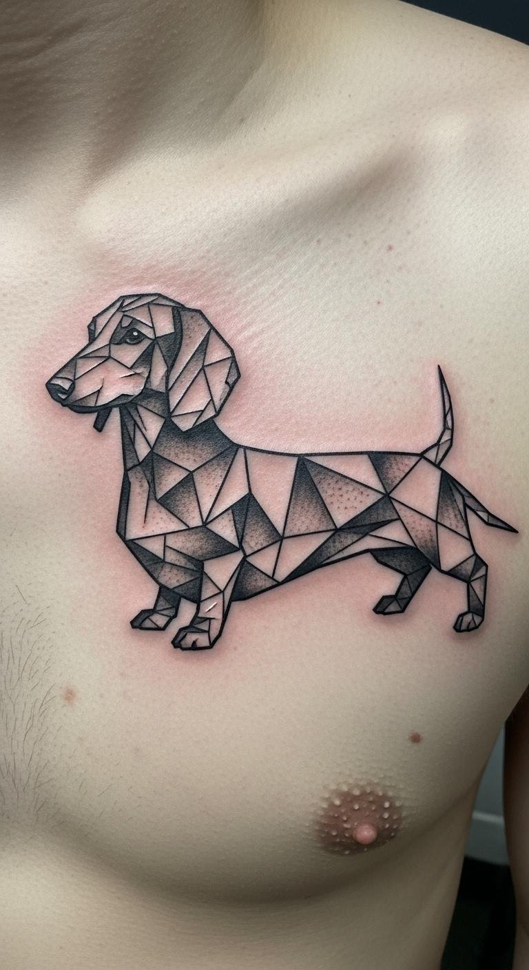 Shapes add a modern edge. A geometric dachshund mixes angles funly. Use graph paper for ideas. Place on chest for impact. About $150. Go bold with patterns. Talk sizes with pros. Heal with natural oils. This one stands out. Budget for basics.