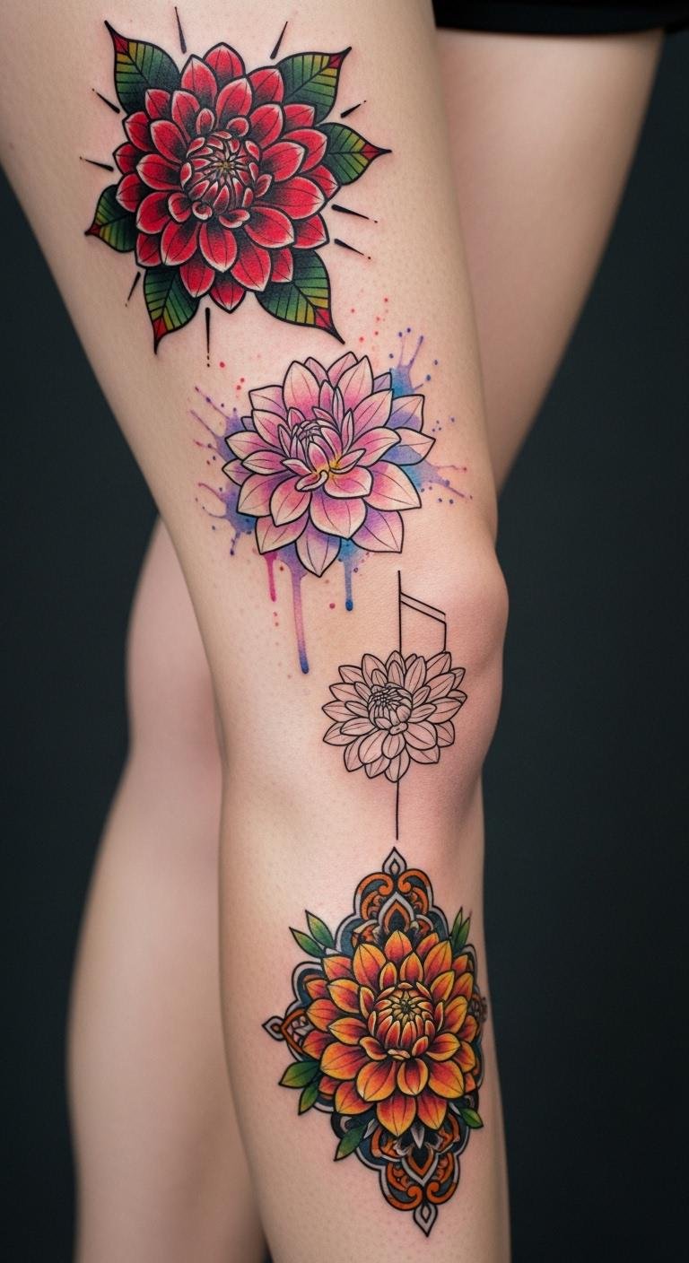 Versatile dahlia tattoos adapt to any style. Switch between looks easily. Experiment with styles in drawings. Prices vary by choice. Place on your leg. Blend elements. Find style samples. This design fits all. Try different papers. You’ll find your match.